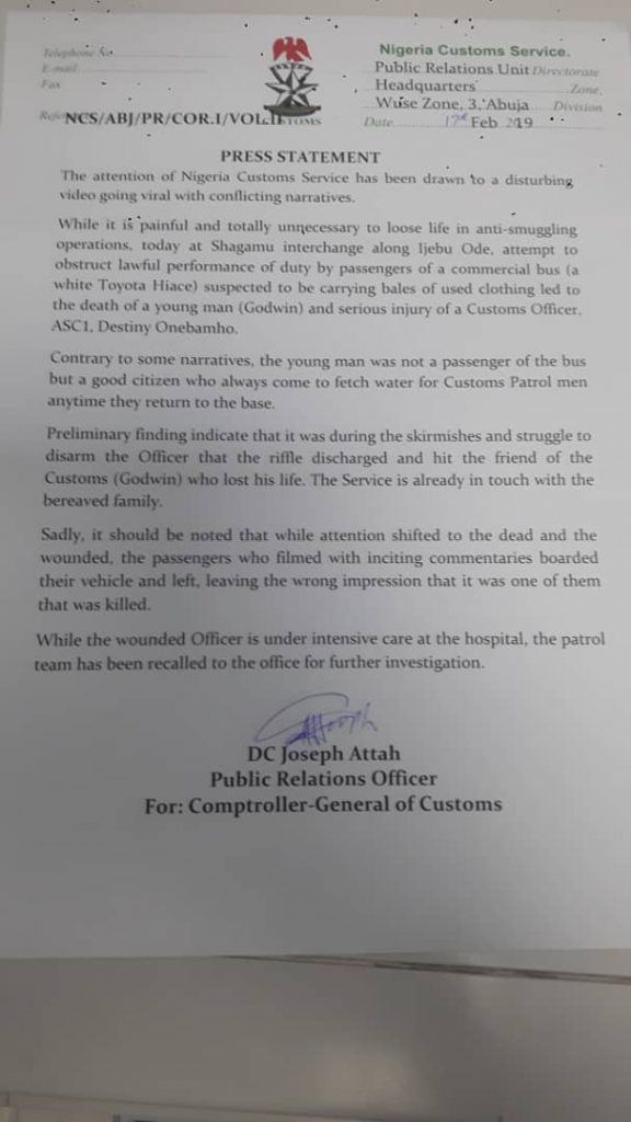 “The attention of Nigeria Customs Service has been drawn to a disturbing video going viral with conflicting narratives.While it is painful and totally unnecessary to lose life in anti-smuggling operations, today at Shagamu interchange along Ijebu Ode, attempt to obstruct lawful performance of duty by passengers of a commercial bus (a white Toyota Hiace) suspected to be carrying bales of used clothing led to the death of a young man (Godwin) and serious injury of a Customs Officer, ASC1, Destiny Onebamho.