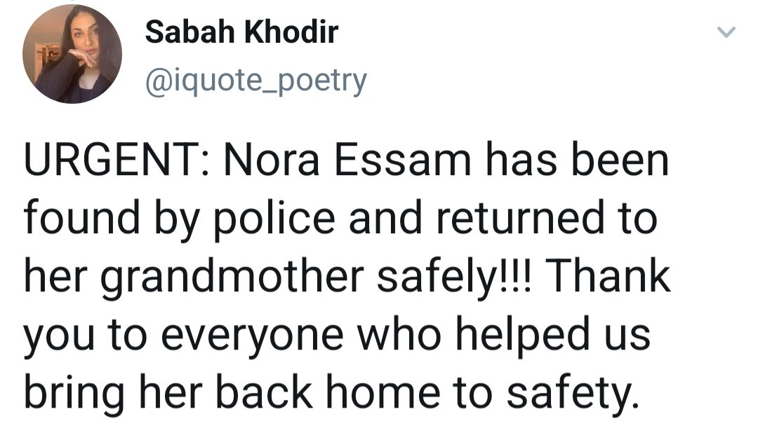 Noura was only saved when police spotted a viral social media appeal to find her.