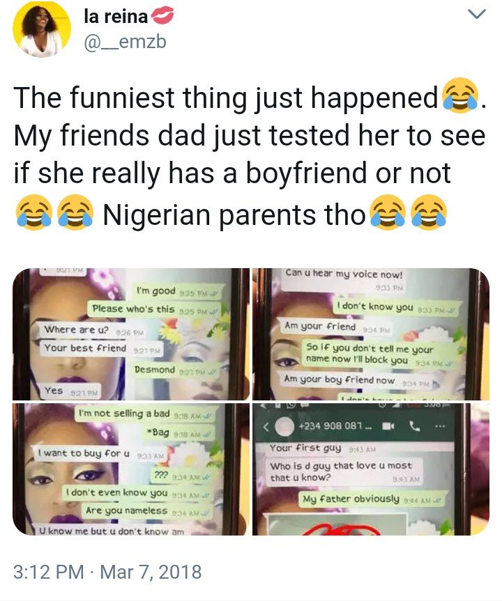 “The funniest thing just happened. My friends dad just tested her to see if she really has a boyfriend or not Nigerian parents tho”
