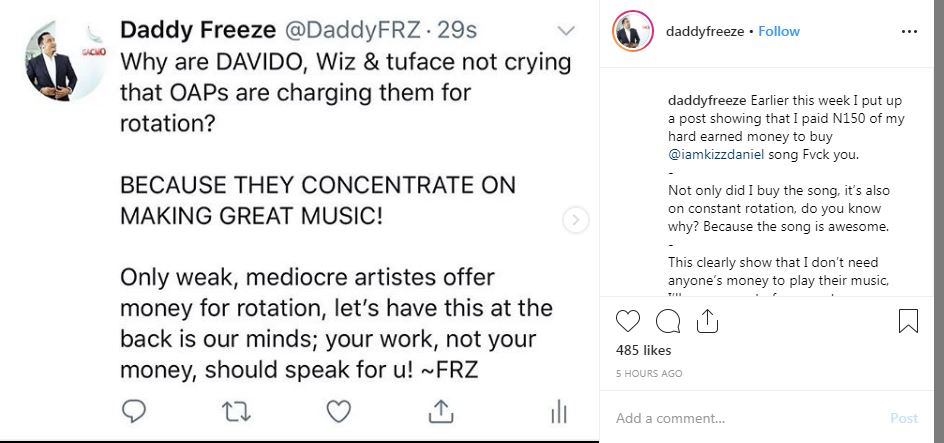 Recently, the Nigerian OAP, Daddy Freeze was accused of charging N100K for the playing an artiste song for promotion and he came out to reply to this claim, see what he wrote…
