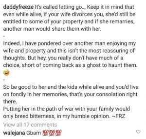 Freeze advised the Twitter user to treat his wife well so that even if he’s dead, he’ll live fondly in her memories.