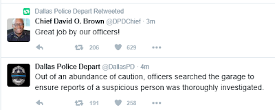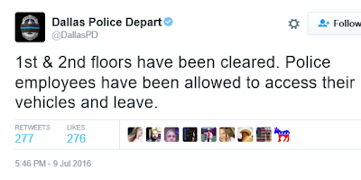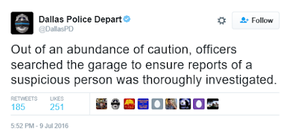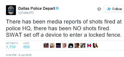 There were news reports that Dallas Police Headquarters was on lock down due to a masked person seen entering the building. However, Dallas Police Dept through their twitter account has debuinked that claim. They said they searched the parking garage looking for a suspicious person based on a tip they received but that the building was not on lockdown. Guess they are on high alert after 5 members of their police force were killed and 7 others were injured by a lone sniper that is now dead.