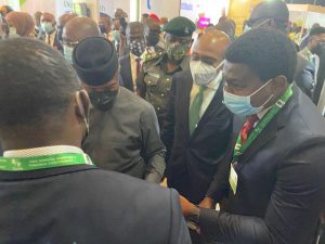 Vice President Professor Yemi Osinbajo, flanked by the Central Bank Governor Godwin Emefiele, and Dana Air’s Head Corporate Communications during the VP’s visit to Dana Air stand at the 14th Annual Banking and Finance Conference by the Chartered Institute of Bankers of Nigeria (CIBN) recently in Abuja.