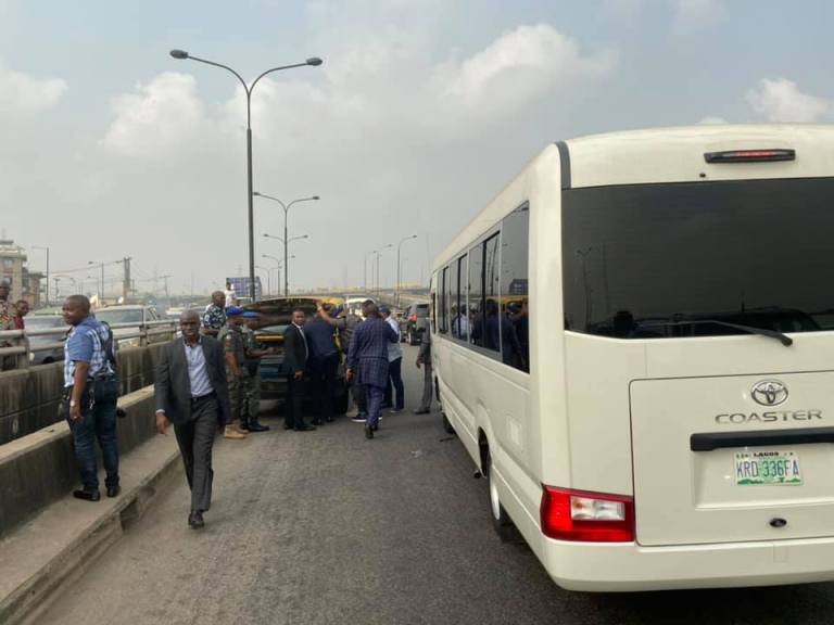 Gov Babajide Sanwo-Olu on several occasions has stated that his administration will not condone one-way driving either from government officials or from commercial drivers. Mother luck ran out against a driver today at the popular Ebute-Ero bridge, the governor who sighted the vehicle from afar stopped his convey to personally arrest the driver, the driver on seeing the governor abandoned his bus and ran for safety.