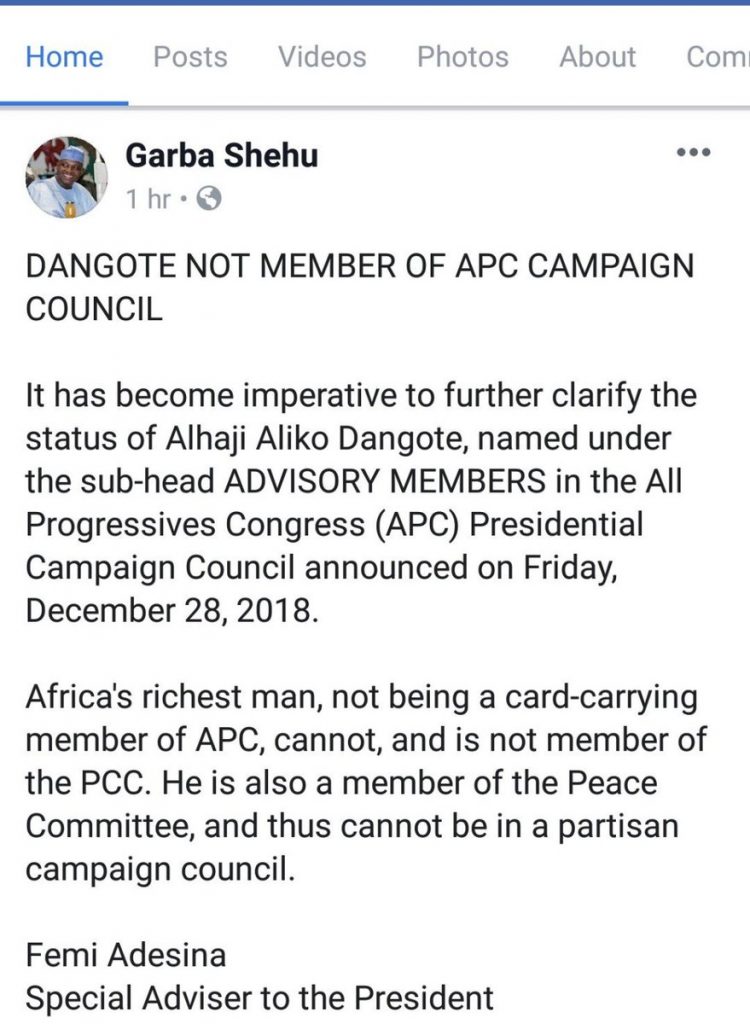 “It has become imperative to further clarify the status of Alhaji Aliko Dangote, named under the sub-head ADVISORY MEMBERS in the All Progressives Congress (APC) Presidential Campaign Council announced on Friday, December 28, 2018.