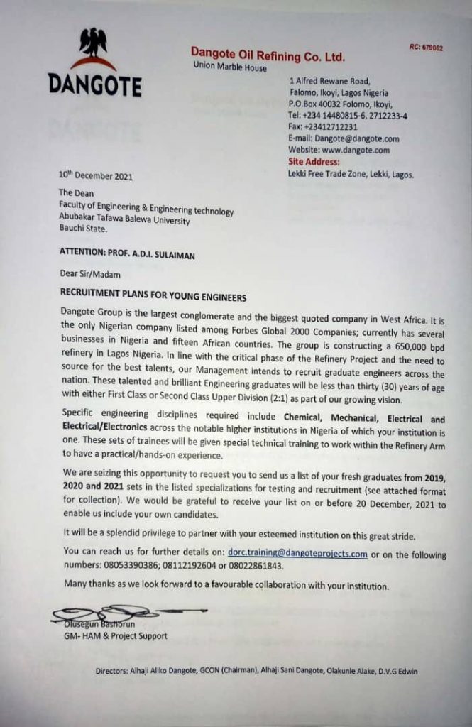 Dangote has directed the absorption of Electrical/Electronic, Mechanical, and Chemical Engineering Graduates from ATBU, Bauchi who graduated between 2019-2021.
