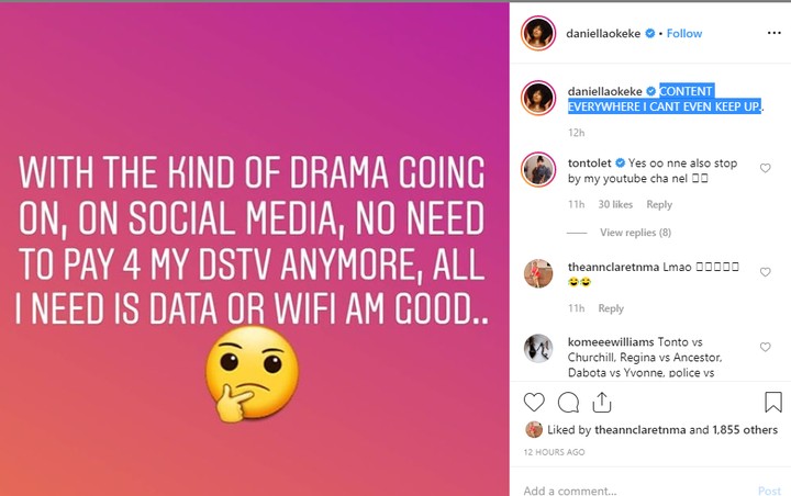 Daniella Okeke who reacted to the drama on Instagram majorly, which centered majorly on Tonto Dikeh’s explosive claims against her ex-husband, has stated that there is no need to pay for her DSTV as all the drama she needs in on social media. Daniella who shared her thoughts of having not to pay for DSTV over the drama on social media, wrote; ‘CONTENT EVERYWHERE I CANT EVEN KEEP UP.’