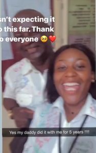 “Then I became the girl whose dad was in her class. This man would leave work and come to class every day. If I’m a minute late, I’m in trouble. He saw my results before me, he pays my fees first before his. So many stories to tell, or how he fell sick and couldn’t walk for days, or how he stood by me when I thought I’d be suspended from school. God, thank you for my daddy. This man is proud of me! And I am proud of him!”
