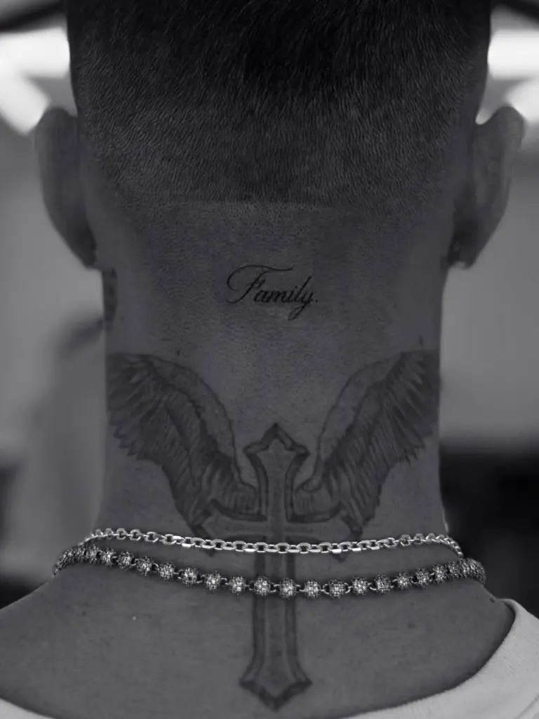 The 23-year-old’s fresh ink, the word “family” in script, was placed above an existing cross and angel wings tattoo on the back of his neck. Photos of the tattoo were shared by his London-based studio, Fineline Hearts Club, on Instagram Sunday, February 8.