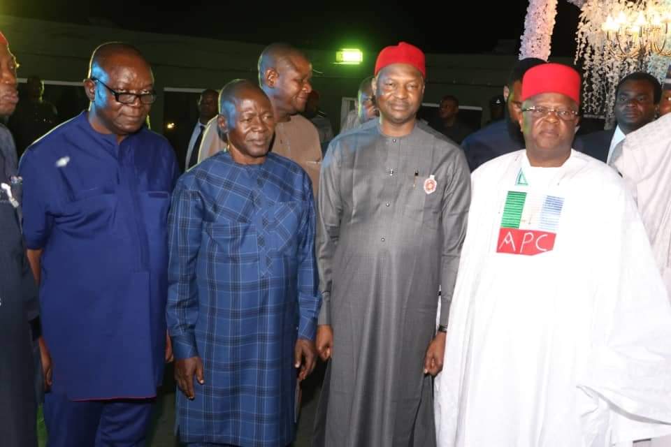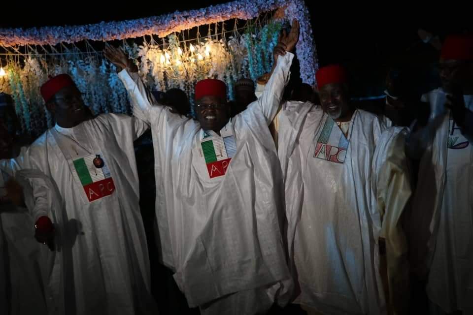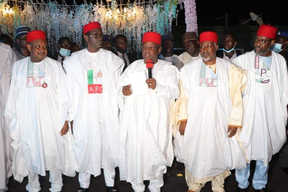 Chairman of Southeast Governors Forum and Governor of Ebonyi State, Engr. David Umahi, FNSE, FNATE fully decorated with the All Progressive Congress (APC) identity by the party caretaker committee chairman, Alh. Mai Bala Buni and other progressive governors at the newly constructed government house, Abakaliki, Ebonyi State.