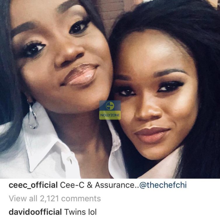 Davido took to former bbnaija housemate and first runner up Instagram to make a comment that Cee c and his girlfriend Chioma are twin.