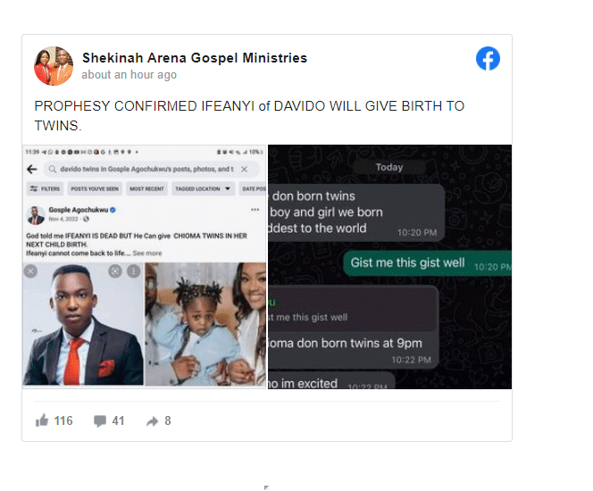 A Nigerian man of God, Evangelist Gospel Agochukwu has claimed that artist Davido and his wife, Chioma have welcomed a set of twins.