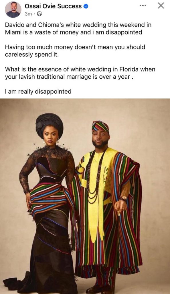 Davido and Chioma’s white wedding this weekend in Miami is a waste of money - Ovie Success Ossai - 9jaflaver