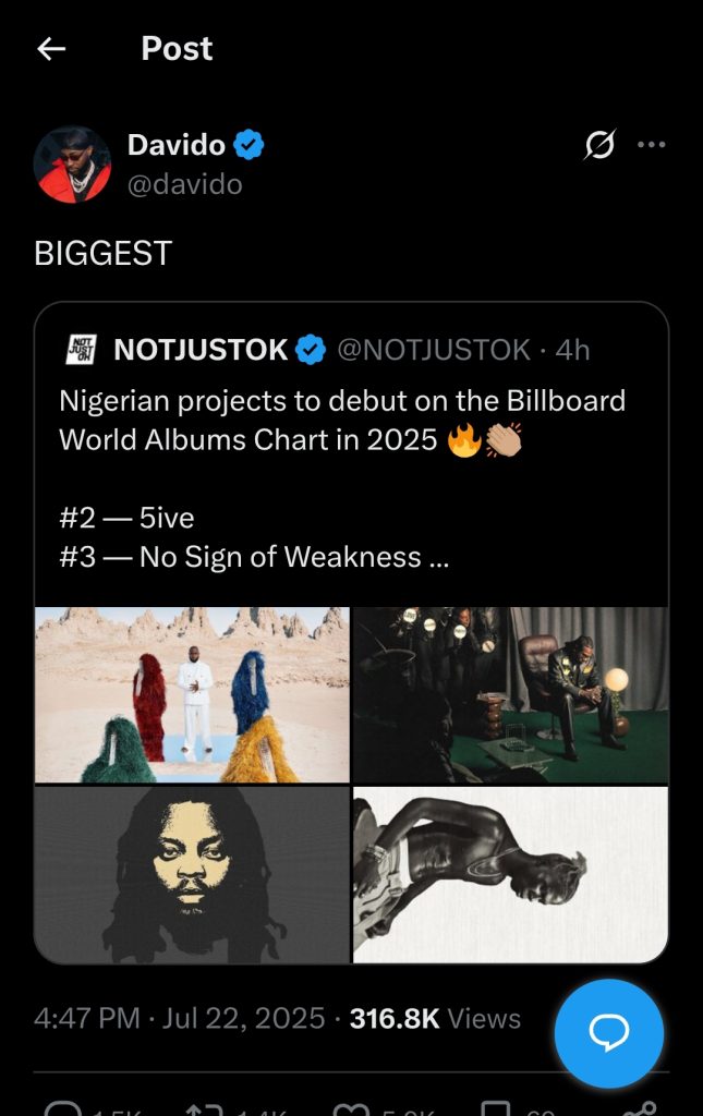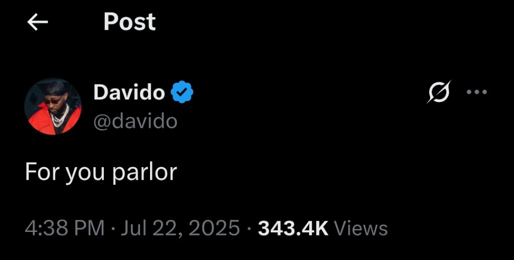 Shortly after, Davido fired back with a mocking response, quoting Wizkid’s tweet and writing, “For your parlor.” He then went on to post a link highlighting his career achievements, further asserting his dominance in the industry.