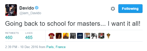Davido has announced he’s going back to the University for his Masters because he wants it all. The 24 year old singer and dad of one had graduated last year from Babcock University in Ogun State. Nice!