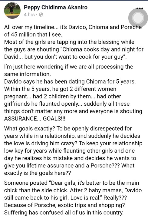 Someone posted “Dear girls, it’s better to be the main chick than the side chick. After 2 baby mamas, Davido still came back to his girl. Love is real.” Really Because of Porsche, exotic trips and shopping? Suffering has confused all of us in this country.