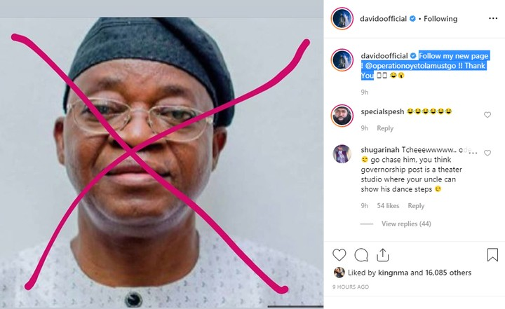 Davido is not left out of the drama on social media today, as he created a new Instagram page to troll on Governor Oyetola who according to him must go. Appealing to his fans to follow the new page ‘operationoyetolamustgo’ he created to troll on Governor Oyetola, Davido wrote; ‘Follow my new page ! @operationoyetolamustgo !! Thank You’