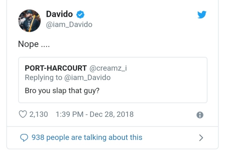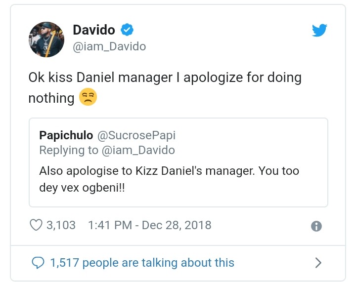 Davido has said he did not slap Kizz Daniel’s manager, Tumi, on his Twitter page while also apologizing for doing nothing.