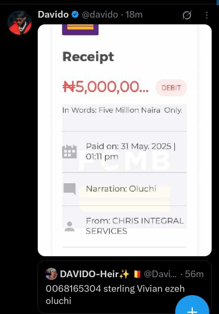 However, Davido responded by requesting the female fan’s account details to send her N5 million for a new wig, and she promptly complied.