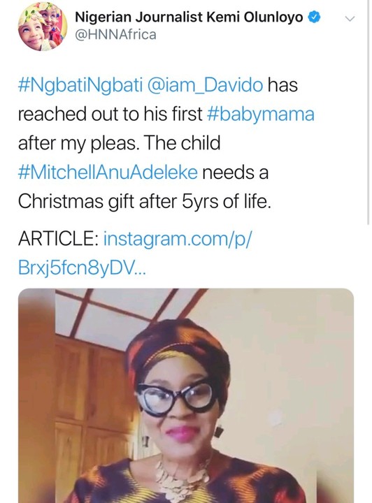 Journalist,Kemi Olunloyo who took up the case and is advocating for Davido to claim Michelle as his first child,shared the news on Twitter .