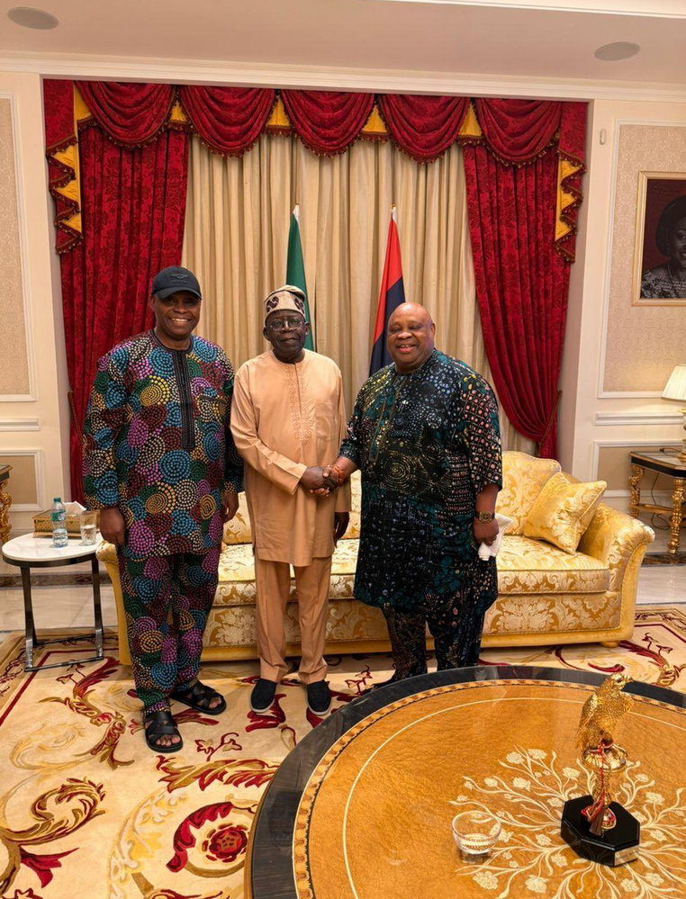 He tweeted, “President Bola Ahmed Tinubu receives in Audience, H.E Ademola Adeleke, the Executive Governor of Osun State and Chief Adedeji Adeleke and his son and Afrobeat star @davido at his residence in Lagos.”