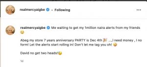 Mercy Aigbe has joined the list of stars begging fans to send them money.