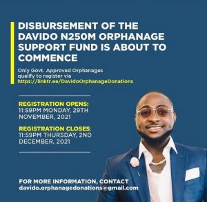 Nigerian singer, Davido who donated the sum of N250 million has announced the application to disburse the funds to orphanage homes.