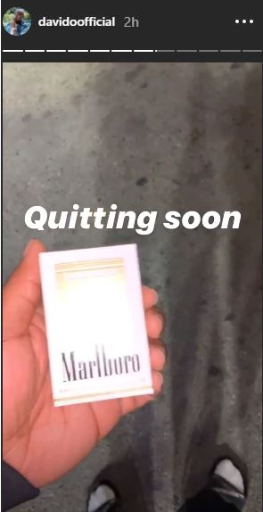 On his Instagram stories published on Wednesday, September 25, 2019, Davido posted a short video of himself holding a pack of Malboro cigarettes with the caption, ‘Quitting soon’.