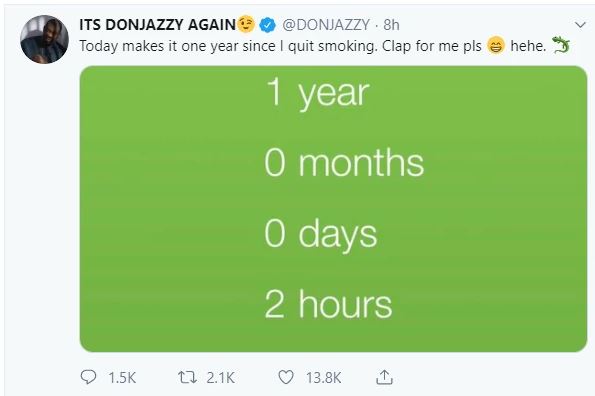 A year after quitting his smoking habit, Don Jazzy took to his Twitter to announce that he has kept to his promise. “Today makes it one year since I quit smoking. Clap for me pls hehe,” he tweeted.