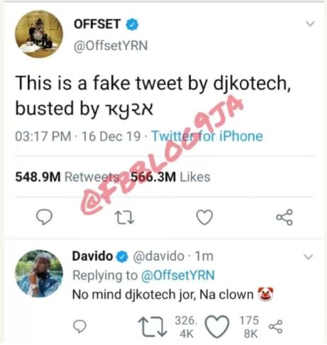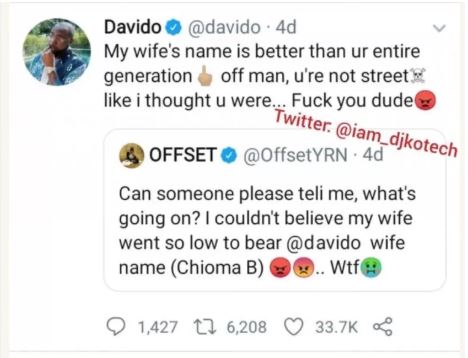 During her stay in the country, she adopted a Nigerian name – Chioma – which is the name Davido’s fiancee bears. In reaction to the new name, a fake tweet purportedly from Offset threw a shade at Davido who responded as seen in the screenshot below.