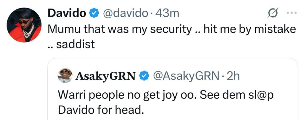 Setting the record straight via his X handle, Davido stated that it was one of his security who hit him mistakenly.