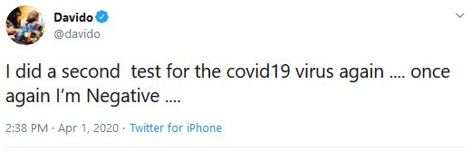 Pop star, David Adeleke, aka Davido, says the result of his second coronavirus test is negative.
