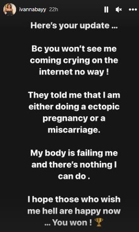 Ivanna, who revealed a few days ago that she woke up with a stomach pain, said doctors informed her she was having an ectopic pregnancy or a miscarriage.