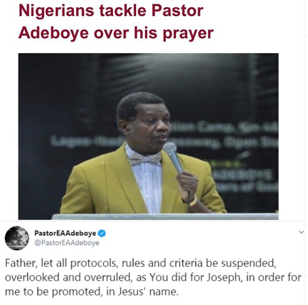 “Father, let all protocols, rules and criteria be suspended, overlooked and overruled, as you did to Joseph, in order for me to be promoted, in Jesus name.” pastor Adeboye’s prayer read