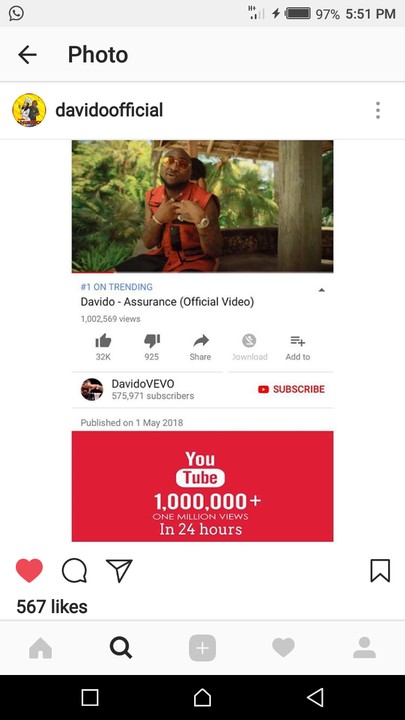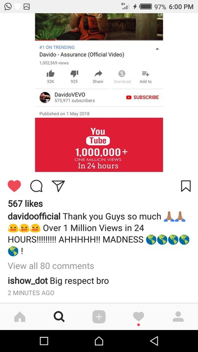 The super excited sensational singer took to Instagram to celebrate his music video, who hit a million views within 24hours of release. He wrote “Thank you guys so much. Over 1 million views in 24 HOURS!!!!!!!! AHHHHH!! MADNESS