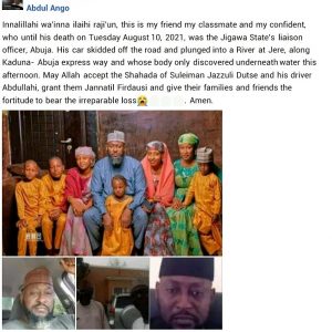 “His car skidded off the road and plunged into a River at Jere, along Kaduna- Abuja express way and whose body only discovered underneath water this afternoon. May Allah accept the Shahada of Suleiman Jazzuli Dutse and his driver Abdullahi, grant them Jannatil Firdausi and give their families and friends the fortitude to bear the irreparable loss” Ango wrote.