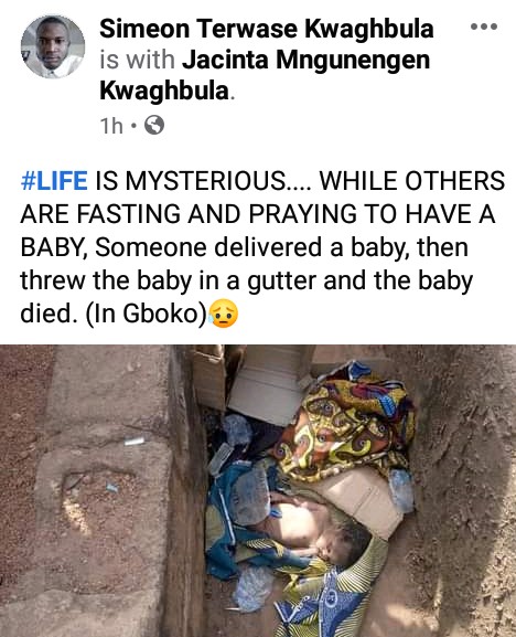 “LIFE IS MYSTERIOUS…. WHILE OTHERS ARE FASTING AND PRAYING TO HAVE A BABY, Someone delivered a baby, then threw the baby in a gutter and the baby died. (In Gboko)”