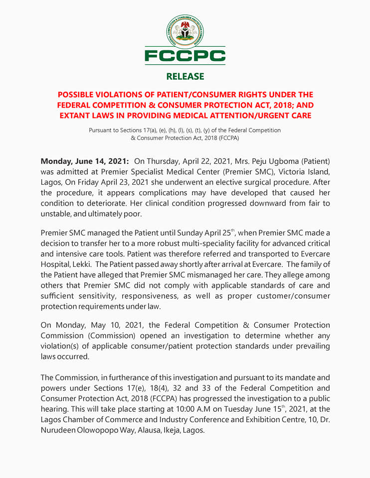 The Federal Consumer Protection Council will hold a public hearing into the death of Mrs. Peju Ugboma after a surgical/medical procedure at Premier Hospital, Victoria Island, Lagos State. The public hearing will take place on Tuesday, June 15, 2021 at the Lagos Chamber of Commerce and Industry Conference and Exhibition Centre at Number 10, Dr Nurudeen Olowopopo Way, Alausa, Ikeja. The public hearing will be shown live on TVC News and it will also be streamed live on YouTube, Facebook and Instagram.