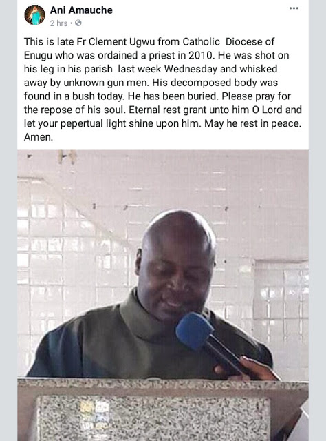 Gunmen have killed a Catholic priest, Reverend Father Clement Ugwu, who was kidnapped from his Parish , St Mark Catholic Church, Obinofia Ndiuno in Ezeagu Local Government Area of Enugu State . The body of late Fr. Ugwu was found in a bush decomposing on Wednesday morning , a week after he was allegedly kidnapped.