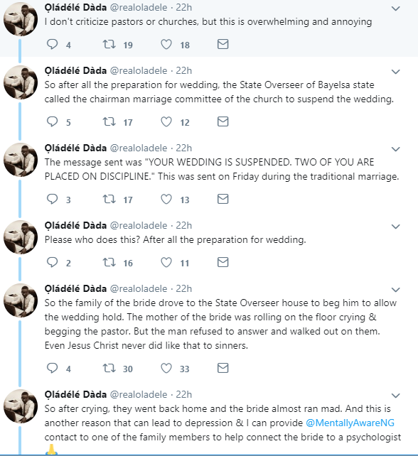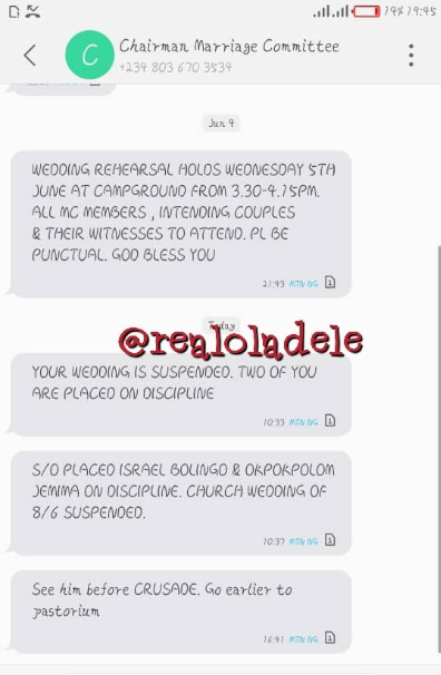 According to Oladele Dada, who shared the story on Twitter along with a screenshot of the message sent by the church to the couple, the Deeper Life State Overseer for Bayelsa state was the one who called the chairman of the marriage committee of the church and asked them to suspend the wedding.