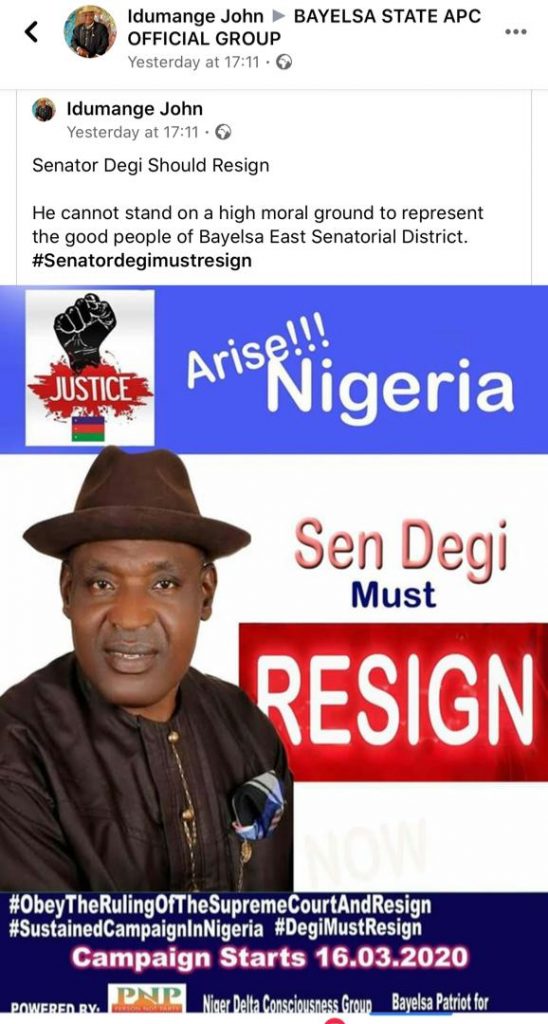 A Bayelsa State political group has called for the immediate Resignation of the Senator Representing Bayelsa East in the Nigerian Senate, Biobarakuma Degi-Eremienyo.