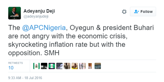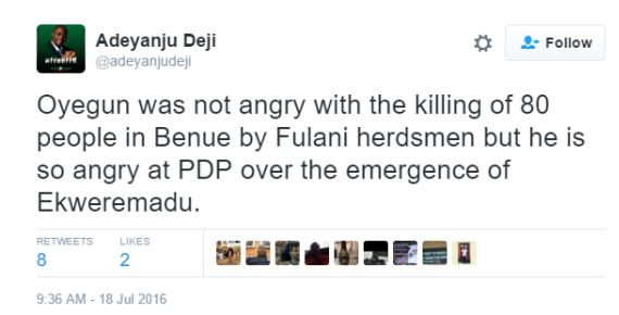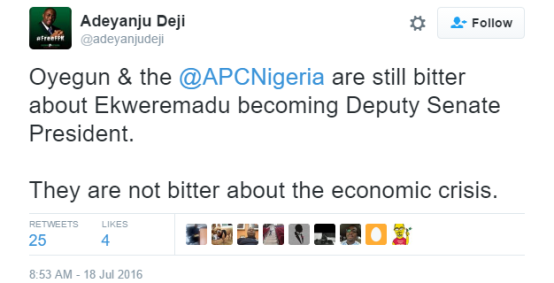 PDP’s New Media Director Deji Adeyanju has reacted to a statement by APC Chairman, John Odigie-Oyegun, in an interview with Channels TV yesterday July 17th. Odigie-Oyegun said APC is still bitter that a PDP member, Ike Ekweremadu emerged as the Deputy Senate President. More tweets after the cut…