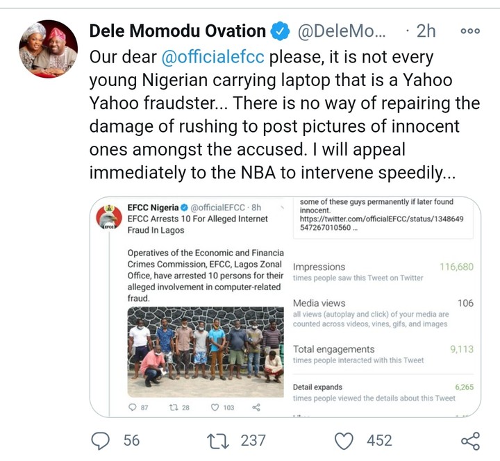“Our dear @officialefcc please, it is not every young Nigerian carrying laptop that is a Yahoo Yahoo fraudster… There is no way of repairing the damage of rushing to post pictures of innocent ones amongst the accused. I will appeal immediately to the NBA to intervene speedily,” he said.