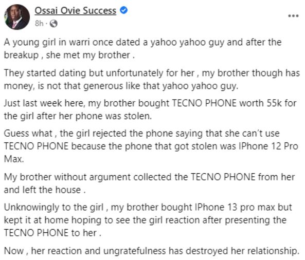 Posting on his Facebook page, Ossai wrote; ”A young girl in warri once dated a yahoo yahoo guy and after the breakup , she met my brother .