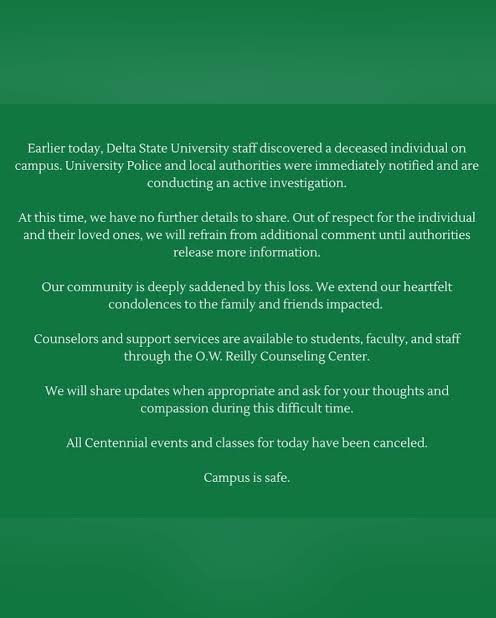 “Earlier today, Delta State University staff discovered a deceased individual on campus,” DSU announced. “University Police and local authorities were immediately notified and are conducting an active investigation.”
