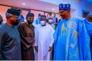 Also, photos of the event showed the President (without a mask on) interacting with Vice-President Yemi Osinbajo; Senate President, Ahmad Lawan; House of Representatives Speaker, Femi Gbajabiamila, who all had their masks tightly fitted.