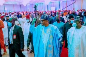 Photos of the event posted by the Personal Assistant to President on Broadcast Media, Buhari Sallau, showed that the President arrived at the event with his mask on but later removed it inside the conference hall.