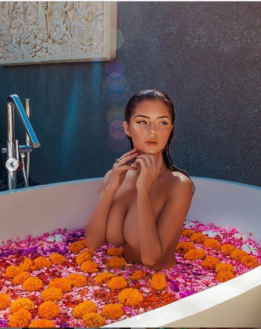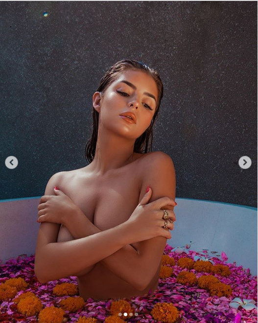 The 24-year-old British model took to her Instagram page to share these topless photos of herself soaking in a bath of flower petals, while strategically placing her arms to cover her modesty.