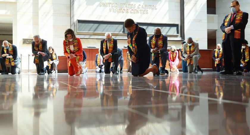 Lawmakers, wearing African kente cloth scarves, knelt in the Capitol Visitor Center before holding a press conference to unveil their legislation in response to almost two weeks of nationwide protests over police brutality toward African Americans.
