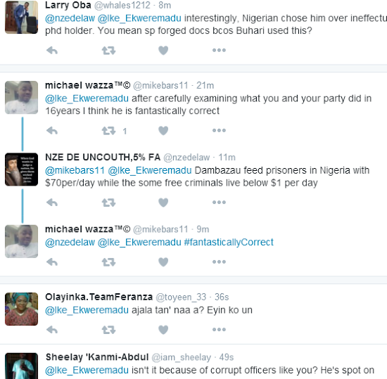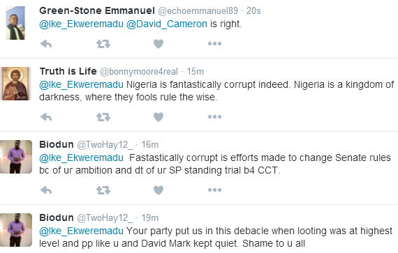 This morning Senate Deputy president Ike Ekweremadu asked Nigerians what they thought about UK Prime Minister David Cameron describing Nigeria as a fantastically corrupt country. Many of the responses accused him and his party, PDP, of being the reason Cameron would describe Nigeria in that manner. See the responses after the cut…